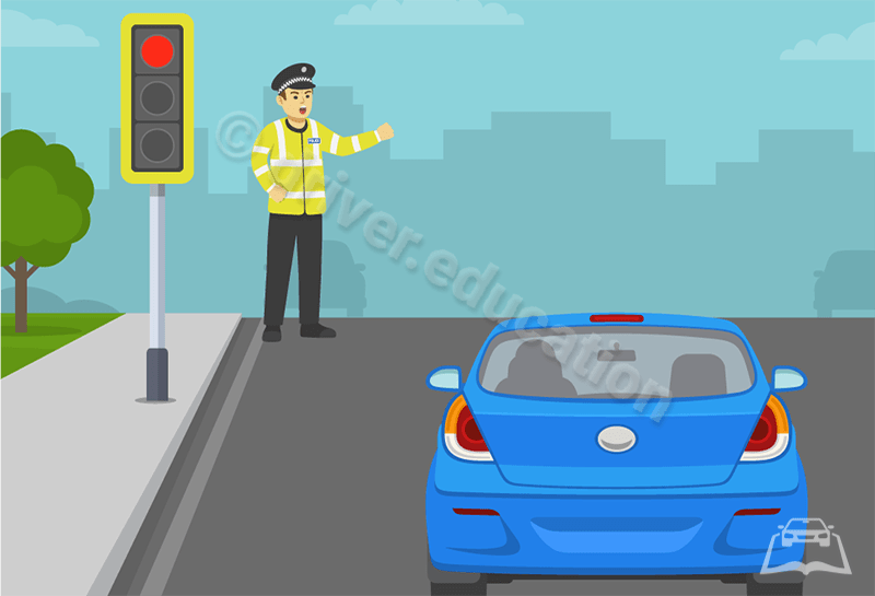 On approaching an intersection where a traffic signal light is red and a policeman motions you to go through, you should...?