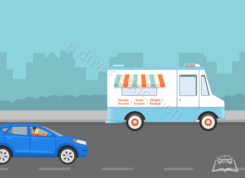 When passing an ice cream truck, you should stop and then proceed at no more than...?